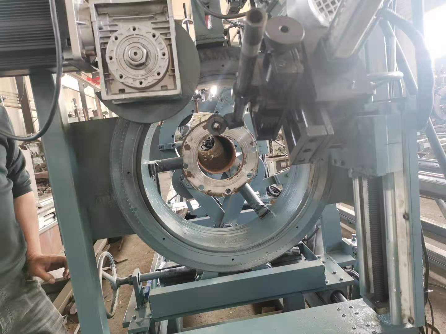 鋼管法蘭焊接設(shè)備,全自動(dòng)鋼管法蘭焊接設(shè)備,全自動(dòng)鋼管焊法蘭盤設(shè)備,全自動(dòng)管道焊法蘭設(shè)備,法蘭不用組對(duì),焊接前把法蘭放在設(shè)備電動(dòng)卡盤上,后按下夾緊按鍵卡盤會(huì)自動(dòng)把法蘭卡好,然后把原材料滾到待料工位,手動(dòng)扳動(dòng)氣缸旋鈕上料板會(huì)把原材料托到托料工位,然后頂緊把法蘭套到管材外徑調(diào)整好距離,按動(dòng)焊接鍵,內(nèi)外槍會(huì)同時(shí)點(diǎn)焊幾秒,時(shí)間可以自己設(shè)定,點(diǎn)焊好后工件會(huì)自動(dòng)旋轉(zhuǎn)一個(gè)九十度,然后就開始焊接,焊好一圈后內(nèi)外槍停孤,按下停止鍵后電動(dòng)卡盤自動(dòng)松開,氣缸回位,手動(dòng)扳動(dòng)卸料氣缸旋鈕焊好后的工件卸下。鋼管法蘭焊接專機(jī),管法蘭焊接設(shè)備,管法蘭焊接專機(jī),四槍同時(shí)焊,焊好鋼管直接從下料架落下,效率提高2.5倍。全自動(dòng)鋼管焊接法蘭盤設(shè)備廠,全自動(dòng)鋼管法蘭焊接設(shè)備,全自動(dòng)鋼管焊法蘭設(shè)備,鋼管焊法蘭設(shè)備,全自動(dòng)鋼管焊法蘭設(shè)備廠,全自動(dòng)鋼管法蘭焊接設(shè)備,全自動(dòng)鋼管焊法蘭盤設(shè)備,全自動(dòng)鋼管法蘭焊接設(shè)備加工法蘭不用組對(duì),四個(gè)焊槍同時(shí)焊接,節(jié)省人工,提高效率2.5至3倍。